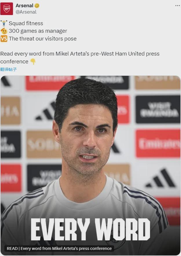 阿尔特塔出席了赛前新闻发布会,我们来看主要内容。加布里埃尔什么情况?你上次说他伤病不严重是吗?是的,我们要在今天的训练后再看看。今天我们几乎还没训练呢,所以我们要看看每个人的情况,但我们不怎么担心加布里埃尔。那因卡皮耶呢?有什么消息吗?他在国际比赛日后就可以复出,我们已经在努力尽快。国际比赛日就要到了,希望在这之后他可以跟队完成几次训练课,然后做好准备。哈弗茨、马杜埃凯和热苏斯依然缺阵?是的,还是那个情况。萨卡又入选了英格兰队,其他几名复出不久的英格兰球员却没有入选,你有没有要求英格兰队管理好萨卡的出场时间?还没有,但我们一直保持着对话,我和图赫尔一直沟通顺畅。首先,我们会告诉图赫尔每名球员现在的身体状况,然后我们也会跟踪了解情况的进展。所以目前我们的沟通是非常顺畅且积极的。你最近42场英超主场比赛只输了4场,其中一半是拜西汉姆所赐,你怎么看?这就是本场比赛的难度,而且他们还有一名新主帅,我们都很了解努诺。我们预计这是一场艰苦的比赛,要求很高,我们需要再次拿出优异的表现才行。这场比赛也是你执教阿森纳的第300场比赛:这可真不少。是不少,而且58%的胜率,你是阿森纳历史最佳(可能指的是胜率)主帅(you're the GOAT of Arsenal managers),你对此感到自豪吗?继续加油。现在唯一重要的就是在周六保持那种感觉和我们做得很好的事情,并希望还有更多。3000场比赛恐怕不现实,但你可以执教阿森纳1300场比赛,这是你的目标吗?目标就是赢下这场比赛,其他的水到渠成。所以从我来到这里的第一天起,我不知道能执教多久,也不知道一路上有谁会陪伴我左右,我唯一能说的就是谢谢你们,我享受每一刻,并且希望未来能有更多。如果还有接下来的300场比赛,你认为什么是成功?赢。你刚才也谈到了胜率,这是阿森纳主帅中最高的,但即便这么高的胜率,我们依然还未赢得重要冠军。所以你必须保持住之前的水平,而这甚至还不够,你必须做得更好,这当然也更艰难,这是我们正在专注的。那么要赢得冠军,你需要成为一名更出色的主帅还是更幸运的主帅?因为有人说过最好是当一名幸运的主帅而不是更好的主帅:也许两者兼有吧。因为在我们的胜率和拿分之下,所有的教练都拿到了冠军,重要的冠军。有时候在体育界,你必须恭喜比你更好的对手,你自己确实很强,但还有其他人更强,而这就是英超提出的要求。廷贝尔是最近一名传闻正在谈判续约的球员,他的表现一直很好,也渴望留队,这符合被奖励的条件不是吗?是的,100%,廷贝尔正是一个例子,尤其是他在艰苦的环境下,在重伤之后王者归来并为球队做出了贡献。希望他能跟我们一起延续一段很长的职业生涯。廷贝尔是目前英超最被低估的球员吗?我不知道,因为我对他评价很高,但我不知道其他人是怎么看待他的,希望也很高。因为廷贝尔几乎拥有你希望在后卫身上看到的所有的能力。以上是新闻发布会的主要内容。伤病方面,加布问题不大,不用担心。因卡皮耶的话,塔子说他能在国际比赛日后复出,也快了。哈弗茨那三个短期内回不来,最早可能也得11月了,好在目前阵容深度完全没问题。西汉姆这几年虽然成绩不佳,但客场踢阿森纳却不含糊,今年决不能再出这种“惊喜”了,在这种球队身上不能再失分,所以这场比赛必须高度重视,切勿轻敌!塔子将迎来执教的第300场比赛,客观说,除了没有英超和欧冠冠军,他已经做得很好了,联系下面记者所说的运气,这里面的确有运气的成分,第一年争冠折了萨利巴,第二年也只是输掉了一场关键战,今年又遭遇了大面积伤病,且赶上利物浦爆种,实在是流年不利,各种debuff叠加……否则正如阿尔特塔所说,这种胜率和拿分之下,其他球队和教练早夺冠了。但无论怎么说,没有冠军就是没有,所以“保持谦虚”没有错,直到阿森纳夺冠,努力吧!用成绩说话!至于廷贝尔续约谈判的消息不是一般的报道,是SM的消息,下面会说。他是不是英超最被低估的球员,这个不好说,我甚至觉得加布最被低估,但每个人心里都有自己的一杆秤。廷贝尔是顶级球员,这点毋庸置疑!