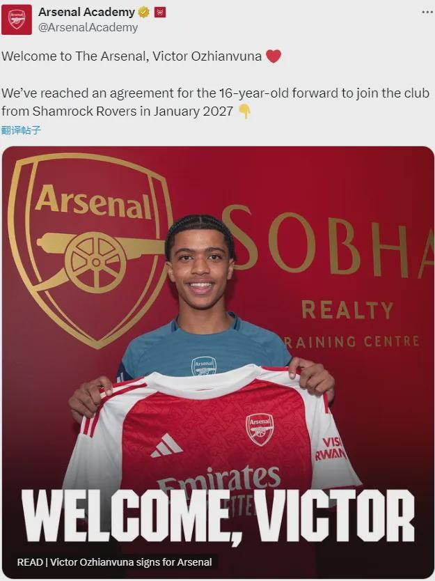官方:阿森纳宣布和沙姆洛克流浪者就维克托-奥日安武纳的转会达成了协议,这名16岁的新星将在2027年1月份年满18周岁后正式登陆北伦敦。虽然年纪轻轻,但奥日安武纳今年早些时候已经代表一线队完成了首秀,并且至今为沙姆洛克流浪者出战了16场比赛,今年2月份时,奥日安武纳还成为了欧协联历史上第二年轻的出场球员,他在对莫尔德的比赛中替补登场。奥日安武纳是一名爱尔兰球员,场上司职攻击型中场(德转显示他是攻击型中场,但阿森纳官方的介绍说他是“前锋“)。根据晚旗报记者SC的消息,这笔交易价值170万英镑,另有浮动。其实这个消息8月底时DO和罗马诺就报道过了,说是默特萨克主导的转会,非常有潜力的希望之星!170万不贵,这个年纪能踢上一线队,哪怕是爱尔兰联赛,也很不得了,好好培养吧,不过他要等到2027年冬天才能入队。至于位置,德转显示他主要踢攻击型中场,两个边路也能客串,阿森纳官网说是“前锋”……我觉得无所谓,这个年龄位置根本就没有定型,可塑性很强。贝尔和萨卡出道时还是踢边后卫/翼卫出身呢……