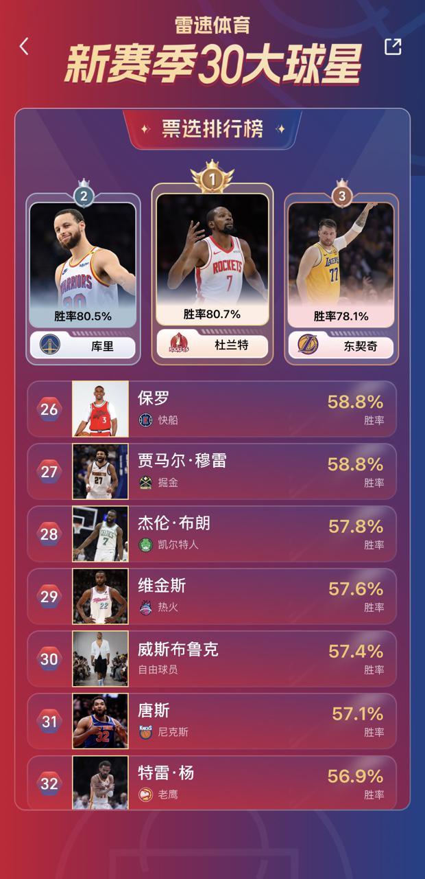 雷速体育10月14日讯 雷速NBA新赛季30大球星活动正在如火如荼地进行中。第一阶段的海选活动于10月14日14:00正式开启,广大老哥们可以从雷速编辑部根据用户搜索习惯以及喜爱程度选出的NBA球员大底池中进行两两PK,选出你心目中更喜爱的那个TA,根据两两PK的胜率得出最终的排名,排名前30的球星将会进入最终的投票阶段。 截止至活动首日10月14日的18:00,目前杜兰特、库里、东契奇的胜率最高位列前三,而中国球员杨瀚森也颇受老哥们的青睐,目前位居前十,并且令人惊喜的是,杨瀚森排名第八,力压超级球星勒布朗·詹姆斯。 而在争夺第三十的位次中,目前几位球星的差距极小,他们都有机会进入到最终的前三十决赛名单中,其中保罗、穆雷胜率稍微领先,布朗、维金斯、威少、唐斯、特雷·杨的胜率差距都在1%之内,谁能进入前三十,形势扑朔迷离。欢迎各位老哥继续多多参与,赢得丰厚奖品!点击前往活动投票页面>>>点击前往活动投票页面>>>点击前往活动投票页面>>>