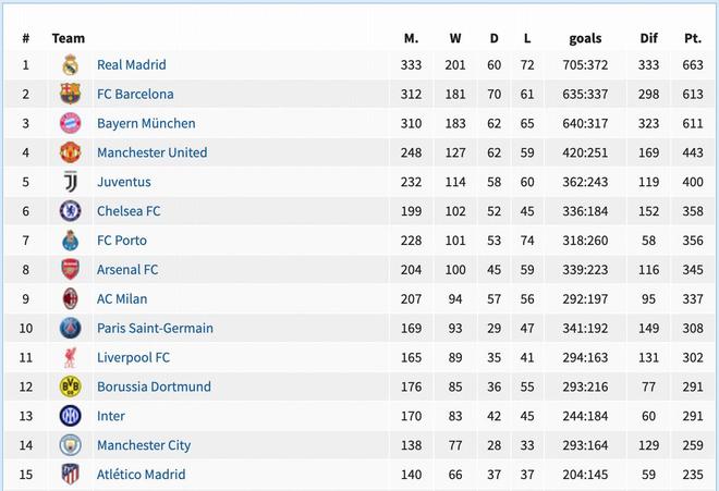 冲击冠军!欧冠改制后总积分榜前14位里,仅阿森纳还未夺冠
