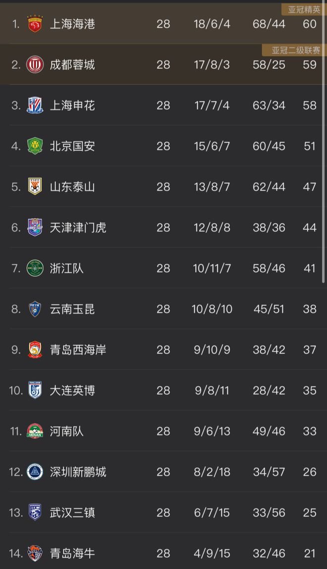 然而面对海港输球的绝佳良机,身后的蓉城和申花却都没能把握住。蓉城在客场面对“无欲无求”的西海岸,德尔加多和古尔芬克尔先后出现致命失误送礼连丢2球,尽管比赛尾声蓉城连进2球并且在第100分钟绝平,但抢回的1分却无法帮助他们重返榜首。在还剩2轮情况下,蓉城依然没有重掌争冠主动权。