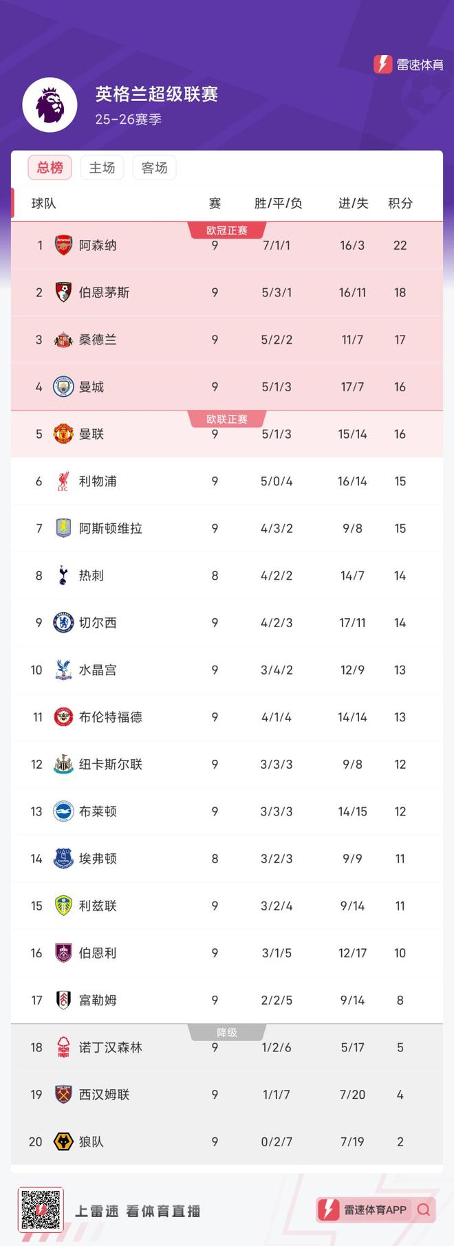 雷速体育10月27日讯 新赛季英超联赛来到第9轮,阿森纳继续领跑积分榜,但在积分榜紧追阿森纳的却不是利物浦、曼城、切尔西等豪门,而是伯恩茅斯、桑德兰。赛季迄今为止,阿森纳7胜1平1负拿到22分,排名榜首。反观另外几支英超传统豪门,卫冕冠军利物浦刚刚遭遇联赛4连败,目前手握15分,未跻身积分榜前5,且已落后阿森纳多达7分。曼城在本轮不敌维拉后,拿到赛季第3场联赛失利,目前手握16分,落后阿森纳已达6分。