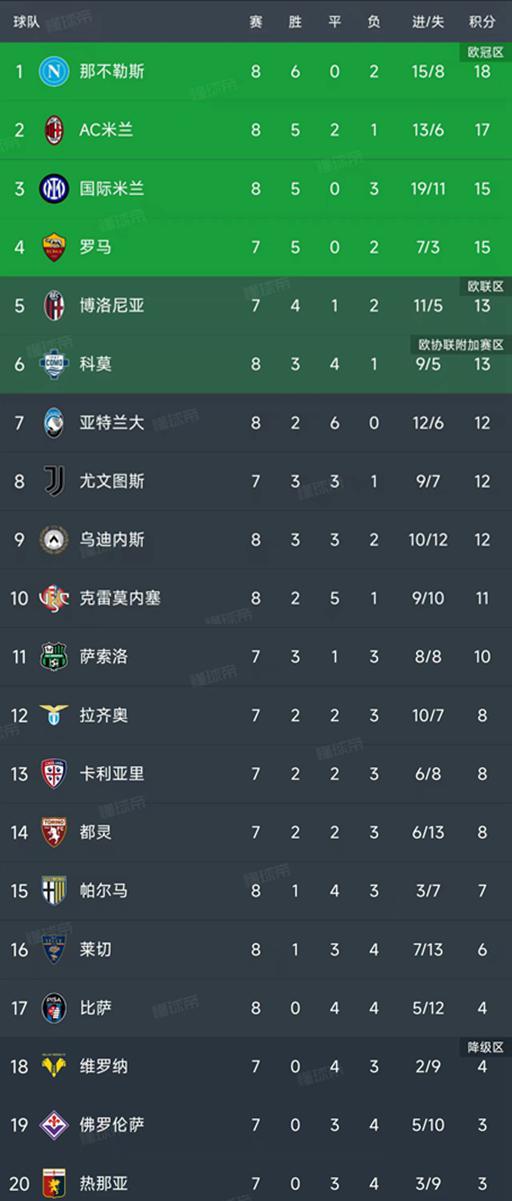 国米第3AC米兰对阵实力一般的比萨在开场第7分钟取得了梦幻开局,莱奥内切远射建功。AC米兰实力占优,比分也取得了领先,但是他们没能扩大优势,反而失误连丢2球,好在伤停补时阿特卡梅远射绝平,AC米兰2-2捞到了一场平局!AC米兰错失了登顶榜首,5胜2平1负积17分暂列第2名。比萨难求一胜4平4负积4分暂列第17名。