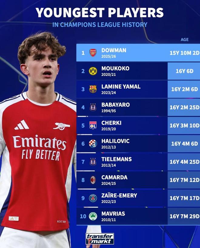 欧冠历史最年轻出场球员前10:1. 道曼(阿森纳) 15岁10个月2天(25-26赛季)2. 穆科科(多特蒙德) 16岁6天(20-21赛季)3. 亚马尔(巴塞罗那) 16岁2个月6天(23-24赛季)4. 巴巴亚罗(安德莱赫特) 16岁2个月25天(94-95赛季)5. 谢尔基(里昂) 16岁3个月10天(19-20赛季)6. 哈利洛维奇(萨格勒布迪纳摩) 16岁4个月6天(12-13赛季)7. 蒂勒曼斯(安德莱赫特) 16岁4个月25天(13-14赛季)8. 卡马尔达(AC米兰) 16岁7个月12天(24-25赛季)9. 扎伊尔-埃梅里(巴黎圣日耳曼) 16岁7个月17天(22-23赛季)10. 马夫里亚斯(帕纳辛奈科斯) 16岁7个月29天(10-11赛季)【上咪咕独家看英超】相关资讯