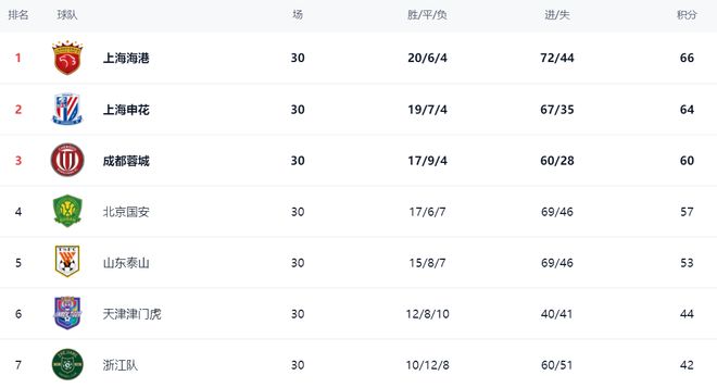 在积分榜上,上海海港66分夺得冠军。上海申花以64分排名第2。成都蓉城以60分排名第3。第4的是北京国安,拿到57分。山东泰山以53分,排名第5。第6的是天津津门虎,拿到44分。梅州客家21分排名倒数第2,长春亚泰以19分排名倒数第1。梅州客家和长春亚泰都降级了。相关资讯