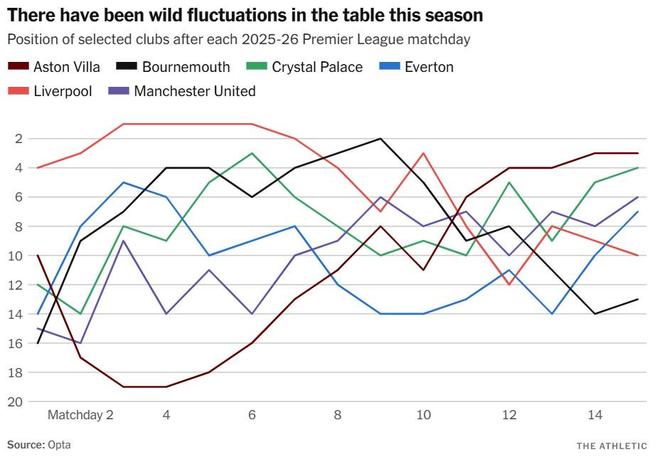 阿斯顿维拉的命运也经历了剧烈波动。赛季初是一团糟,夏窗最后几周的疯狂引援结果签下的球员几乎没怎么出场。一连串灾难性的结果让他们在五场比赛后跌入降级区,有阴暗的议论说主帅埃梅里的计划在第四年就要分崩离析,糟糕的引援将毁掉他们的赛季,情况正在走下坡路。现在,在一连串出色的战绩之后(接下来10场联赛赢了9场),他们已被视为冠军挑战者。维拉在九月底还排在20队中的第19位——现在他们高居第三。本赛季没有其他球队经历过如此极端的联赛排名波动。看看这张图表,它可能看起来像孩子用蜡笔随意画的线条,但实际上它可视化地展示了部分球队联赛排名的波动情况。维拉和利物浦的曲线最为极端,但你可以选择你感兴趣的球队,将鼠标悬停在其代表曲线上,以揭示他们迄今为止命运的更多信息。
