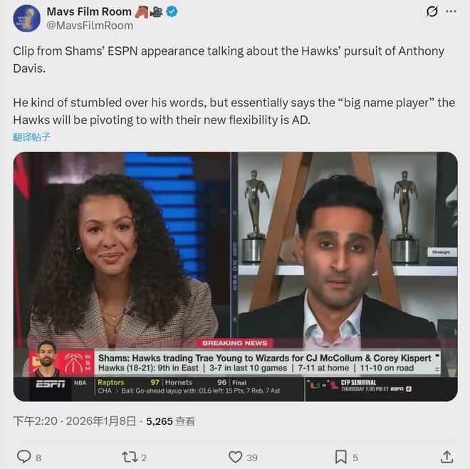 北京时间1月8日,据ESPN名记Shams报道,老鹰送走特雷杨之后,球队将加大力度追求独行侠内线安东尼-戴维斯。CJ-麦克拉姆本赛季薪水3067万美元,今年夏天合同到期。此外,老鹰阵中的波尔津吉斯和肯纳德等都是到期合同。
