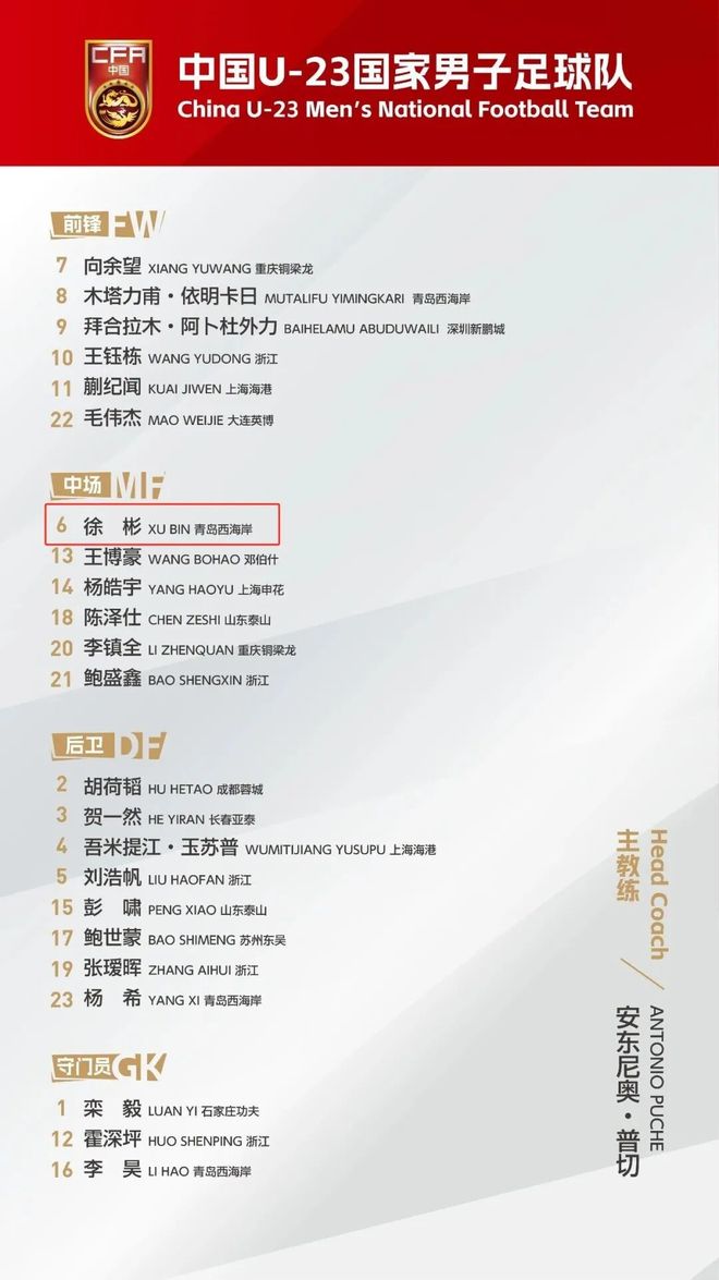 1月4日,2026年U23亚洲杯中国队23人参赛名单正式公布,现效力于中超青岛西海岸的湖南籍球员徐彬入围,徐彬来自益阳市南县,出生于2004年5月2日,在球场上司职后卫,出道于恒大足校,后入选广州队一线队征战中甲联赛。2025年,徐彬转会青岛西海岸参加中超联赛,出场27次首发21次,贡献3次助攻,同年2月28日,入选中国男足国家队2025年第二期集训名单。