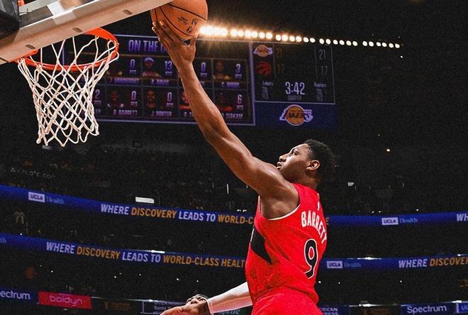 首先,我们来说说巴雷特在进攻端的贡献,本赛季由于英格拉姆的到来,他的出手权有所减少,但仍旧可以贡献19.6分、5.1个篮板和3.5次助攻,投篮和三分命中率分别达到了50%和34.5%,虽然三分球的投射有些不太稳定,但这很大程度上,还是因为他的伤病问题,毕竟在23-24赛季转会回到了猛龙队之后,三分命中率达到了39.2%,所以他的火力基本覆盖了内外线。